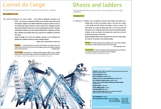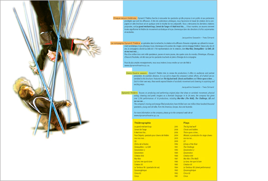 DynamO Théâtre fait du théâtre de mouvement. Les photos de scène ont donc été manipulées pour sentir le mouvement et les les éclairages dramatiques et chatoyants.